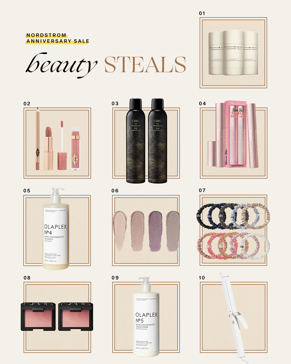 01. Donna Karan Deodorant | 02. Charlotte Tilbury Pillow Talk Set | 03. Oribe Texturizing Spray | 04. Better Than Sex Mascara | 05. Olaplex Shapoo | 06. Bobbi Brown Eyeshadow Sticks | 07. Slip Silk Scrunchies | 08. Nars Orgasm Blush | 09. Olaplex Conditioner | 10. T3 Curling Iron