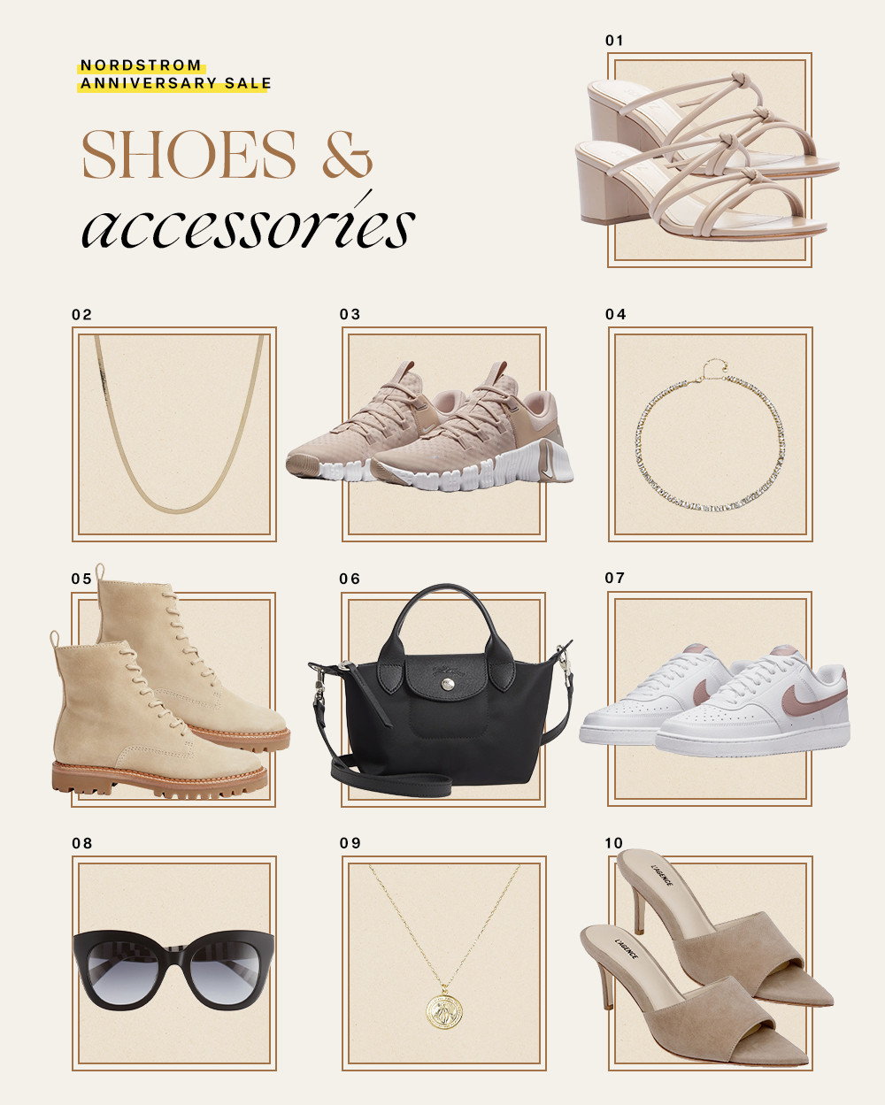 01. Strappy Sandals | 02. Gold Herringbone Necklace | 03. Nike Free Metcon Shoes | 04. Crystal Necklace | 05. Suede Lug Boots | 06. Longchamp Bag | 07. Nike Court Sneakers | 08. Kate Spade Sunglasses | 09. Pendant Necklace | 10. Suede Pointed Toe Sandals
