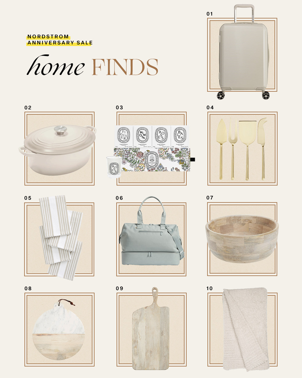 01. Vacay Suitcase | 02. Le Creuset Dutch Oven | 03. Diptyque Candle Set | 04. Gold Cheese Knives | 05. Kitchen Towels | 06. Beis Weekender Duffle Bag | 07. Wooden Serving Bowl | 08. Round Marble Cheese Board | 09. Mango Cheese Board | 10. Barefoot Dreams Blanket